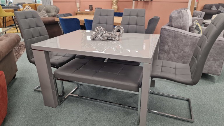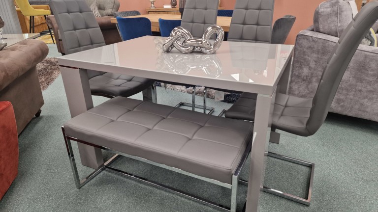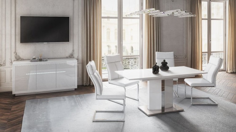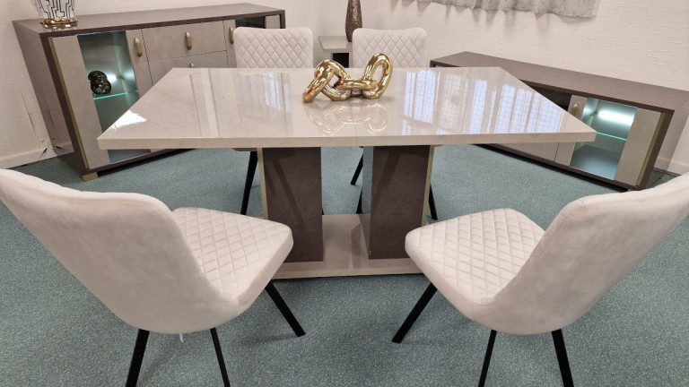 Our dining tables are available in a variety of colours and materials including glass, high gloss, marble, metal, brushed aluminium, stone, granite, wood veneer, solid oak and pine so there is a finish to suit every home. Table construction also differs with a variety of legs or bases ranging from traditional to modern, with standard legs to mirrored finishes or sculptural designs. Many tables and their bases feature mixed materials and finishes for example high gloss paired with marble or metal accents to offer a standout aesthetic that can be both classic and contemporary. Our dining tables are available in most colours.